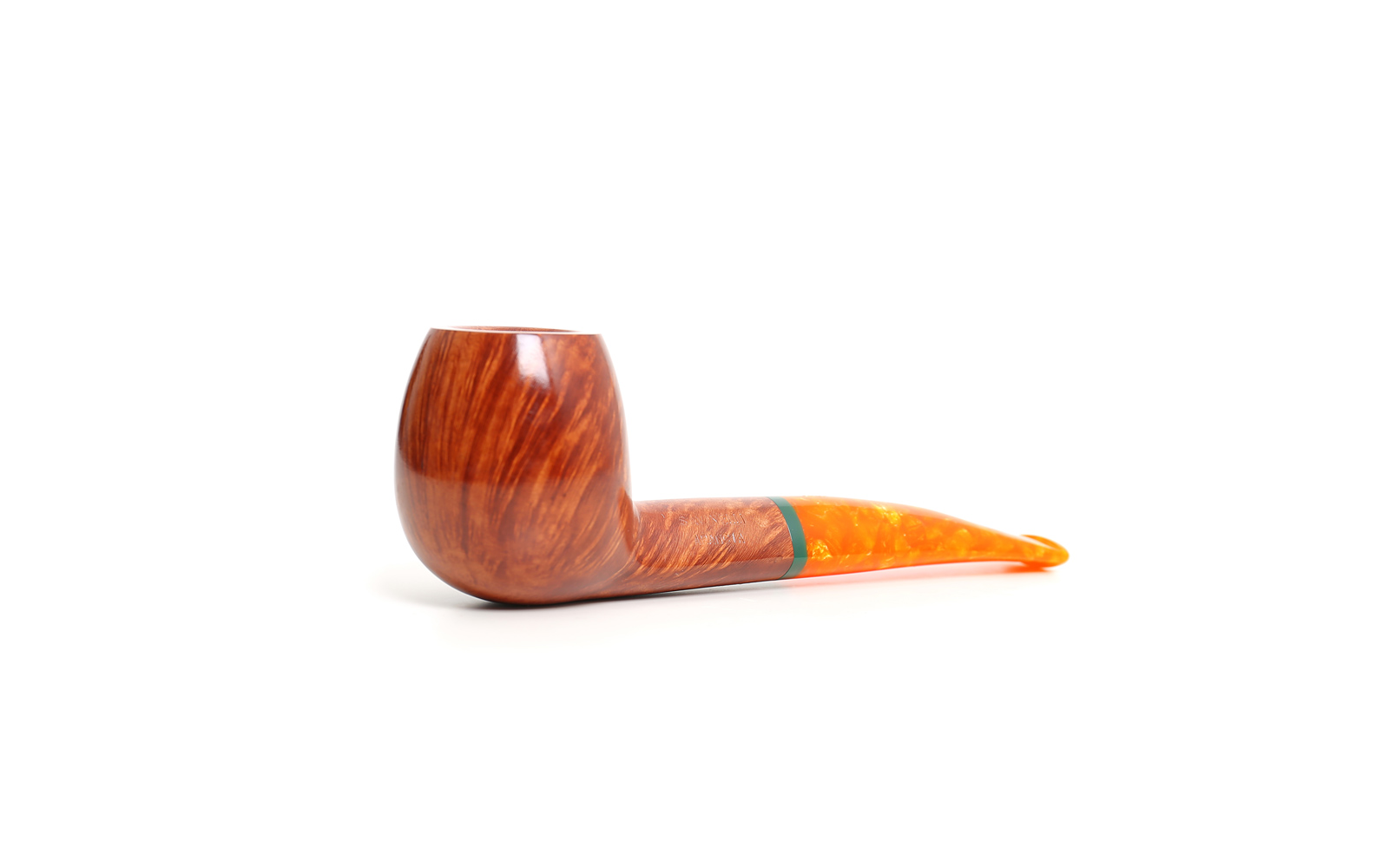 Die Aromaserie mit Orangenaroma wird in 6 Modellen in einer glatten Oberfläche vorgeschlagen, nur in Orange erhältlich, das perfekt mit dem Craquele-Methacrylat-Mundstück mit einem grünen Ring harmoniert, um die Kontinuität der Farbe zu unterbrechen und insgesamt ein Ergebnis von Frische und visueller Wahrhaftigkeit mit der Referenzfrucht zu erzielen. Hier schlagen wir das Modell 173 vor - Ein ungerader Apfel mit einer abgerundeten Schale. Seine Besonderheit ist der dreieckige Schaft, den nur wenige Pfeifenhersteller anbieten können.