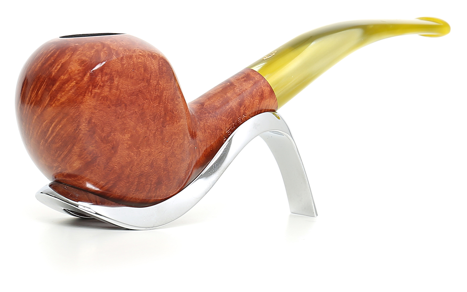 Elegante Freehand-Pfeife der Artisan-Serie mit gebogener Form. Glattes braunes Finish mit ausgezeichneter Maserung, die entlang der Pfeifenkopfes sichtbar ist. Ockerfarbener Acrylsteg. Lochdurchmesser 6mm.