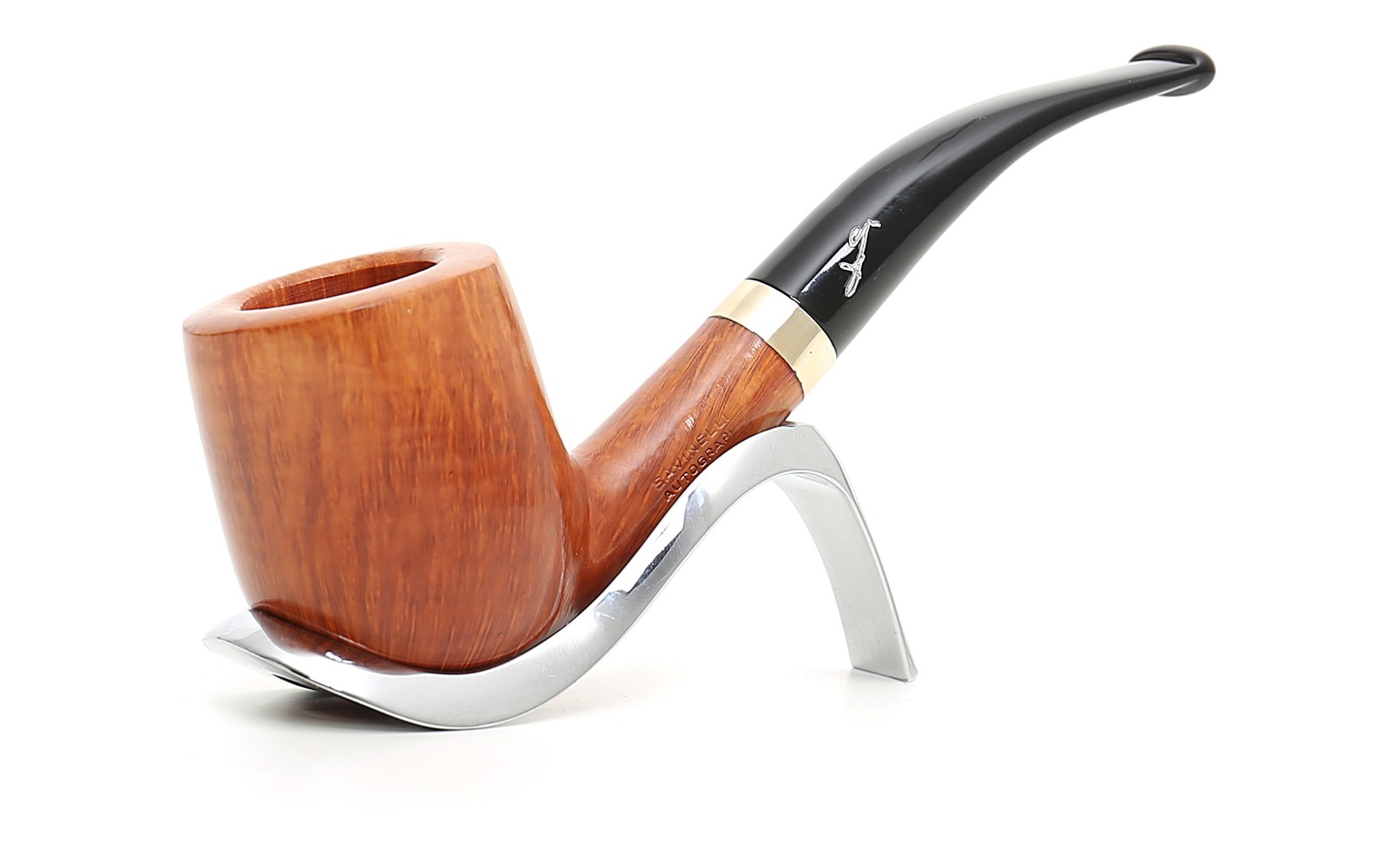 Die sehr strengen Qualitätsstandards, denen Autograph-Pfeifen folgen müssen, beschränken die Produktion auf nur wenige Stücke pro Jahr. Völlig von Hand geschnitzt, repräsentieren diese Pfeifen das Beste, was die Handwerker von Savinelli zu bieten haben. Autograph-Pfeifen werden je nach Bruyère-Qualität in mehrere verschiedene Gruppen eingeteilt, die die prestigeträchtigsten Pfeifen kennzeichnen. Die angesehensten Gruppen sind 000, 00 und 0. Andere Gruppen in absteigender Reihenfolge sind 8, 6, 5, 4, 3. Dann gibt es Autograph-Pfeifen, die teilweise oder vollständig sandgestrahlt sind. Hier schlagen wir eine Autograph Gr. 5 vor. Diese Pfeife hat eine gebogene Form und montiert ein schwarzes Acryl-Mundstück mit der klassischen Savinelli-Signatur. Lochdurchmesser: 9 mm.