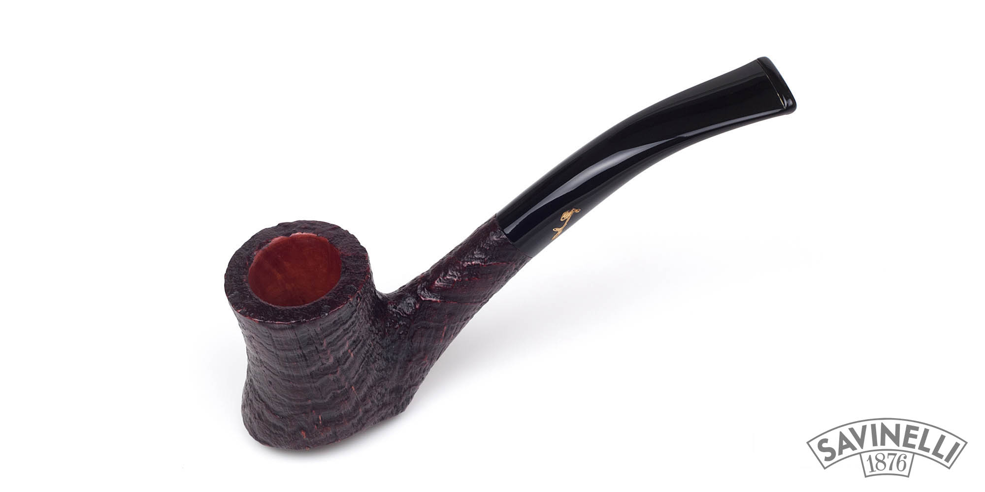 Diese wunderschöne und einzigartige Pfeife hat eine abgerundete Schale, die leicht nach vorne geneigt ist, ähnlich dem Apple-Stil. Die Kammer ist tief. Die starke Neigung des Pfeifenhalss im Vergleich zur Schale erzeugt einen sehr ausgeprägten Bogen. Die beiden kleinen konkaven Rillen machen die Schalenform sehr ergonomisch und angenehm zu halten. Ein Ahornband trennt den geflammten Pfeifenhalss vom konischen Acrylmundstück. Savinelli garantiert eine außergewöhnliche Qualität des Bruyèreholzes, völlig ohne Gips und Fehler.