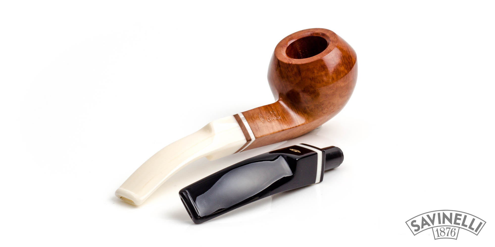 Diese Savinelli Pfeifen Serie feiert, wie auch heute noch, die Herstellung von Pfeifen als einen wirklich handwerklichen Prozess, der fast ausschließlich natürliche Materialien verwendet. Kein Füllstoff oder zugefügter Farbstoff, diese Pfeife wird nur mit rein natürlichen Materialien hergestellt. Lediglich das Acrylmundstück ist ein künstliches Material. Das Modell 623 ist die Savinelli Interpretation des gebogenen Bulldog-Stils. Seine Besonderheiten sind die besondere diamantförmige Schale und der quadratische Schaft. Dieses Modell ist mit einem raffinierten Sattelstiel ausgestattet. Die Pfeife wird mit zwei Mundstücken geliefert, eines weiß und eines schwarz.