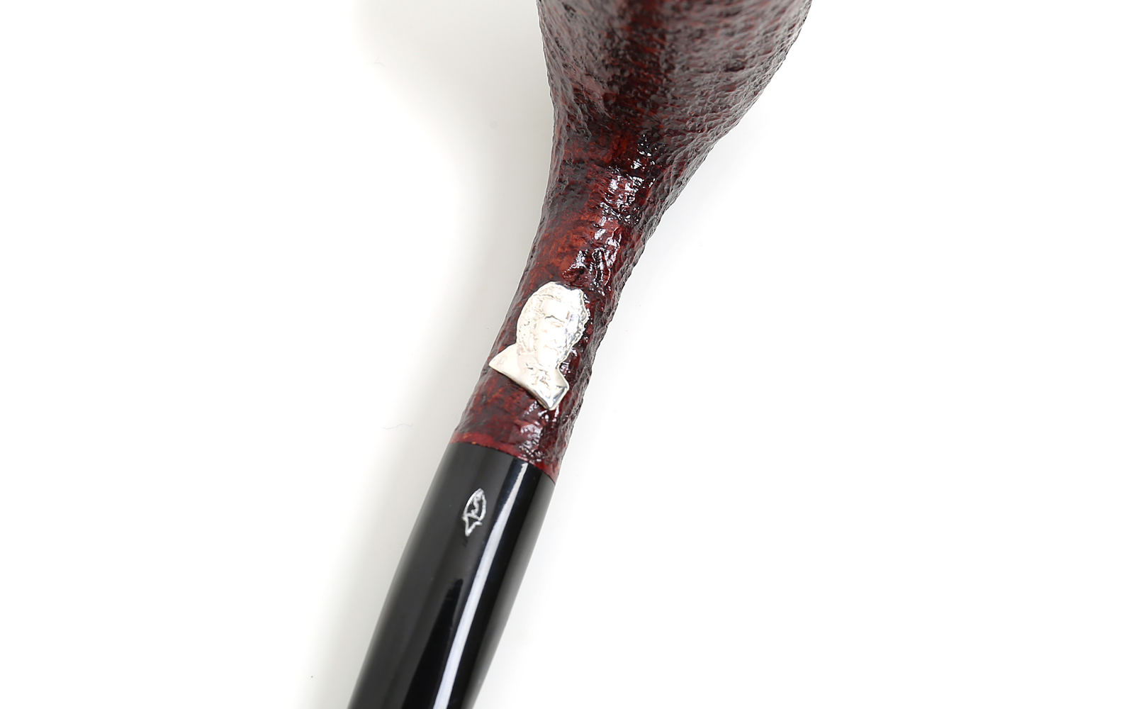 Gerade Dublin Pfeife mit brauner rustizierter Oberfläche, verziert mit einem Silberrelief des Dichters Gesichts am Pfeifenstummel.