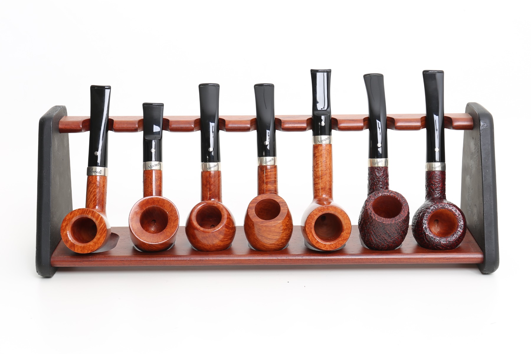 Raucher wissen, dass eine Pfeife Ruhe braucht, und daher besitzt ein vorsichtiger Raucher mindestens sieben Pfeifen, eine für jeden Tag der Woche. Wir haben eine Auswahl an Modellen und Veredelungen für illustrative Zwecke zusammengestellt und sie mit einem maßgefertigten Silberring verziert, der mit dem Wochentag graviert ist. Welchen Tag bevorzugen Sie? Für Donnerstag empfehlen wir das Modell 670 KS, das die Savinelli Egg-Stilinterpretation darstellt. Dieser Stil kann als eine höher gewölbte Apfelversion betrachtet werden. Gut ausbalanciert und selbstbewusst im Griff. Die Pfeife ist eine Punto Oro mit einer glatten Naturveredelung, die schon immer für ihre Eleganz, Seriosität und Tradition bekannt ist. Schwarzer Acrylstiel mit einem silberfarbenen Punkt.