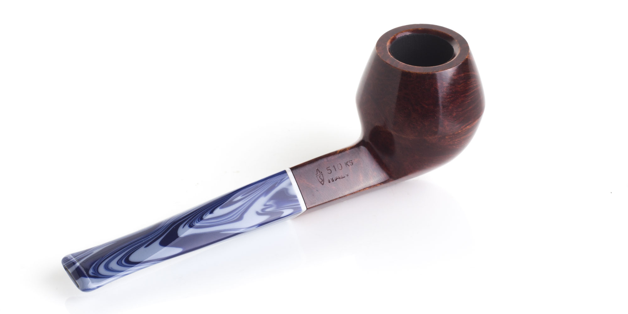 Der blaue und weiße Acrylstiel ist ein Tribut an den schäumenden Ozean. Zwei verschiedene Oberflächen, glattes Burgunderrot und rustikales Burgunderrot. Ein kleiner weißer Ring verbindet die Farben von Stiel und Pfeifenkopf. Das Modell 510 KS ist ein gerader Bulldog mit dem typischen diamantförmigen Pfeifenkopf und einem quadratischen Schaft. Ein sehr berühmter Stil mit vielen Liebhabern auf der ganzen Welt.